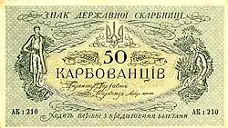 Во время падения режима гетмана, при проходившем параллельно занятии войсками Антанты Одессы, под контроль Добровольческой армии попала типография Фесенка, на которой её представителями были обнаружены клише купюры в 50 украинских карбованцев. Они наладили её выпуск без согласования с Директорией УНР, в связи с чем последней в Одессу была направленна делегация во главе с Сергеем Бородаевским, которой была поставлена задача вывезти из города клише для изготовления украинских денег или убедить добровольческое командование печатать свои, а не украинские деньги. На свой запрос Бородаевский получил отказ, после чего обвинил Командование Добровольческой армии в фальшивомонетничестве[13].