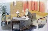 Лист из альбома — последние дни Л.Н. Толстого. За последней работой (Оптина пустынь). Бумага, карандаш. Авторская литография. 29х45 см. 1911.
