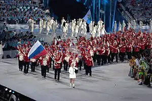 Знаменосец сборной России на церемонии открытия — Алексей Морозов, капитан сборной России по хоккею с шайбой и казанского хоккейного клуба «Ак Барс». Третий раз подряд (2006, 2008 и 2010) на церемониях открытия летних и зимних Олимпийских игр флаг России нёс спортсмен, не выигравший к этому моменту ни одной золотой олимпийской медали. До этого на 6 Олимпиадах (1994—2004), в которых Россия участвовала как независимое государство, флаг несли только олимпийские чемпионы.