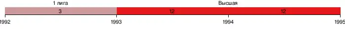 | 1993 | «Россия» | Россия | Высшая лига | 12 из 12 | 22 | 2 | 1 | 19 | 12—99 | 5 | 1/8 финала | [1][5][6] | |