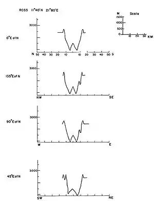 На приведенном графике представлено сечение кратера в различных направлениях[5], масштаб по оси ординат указан в футах, масштаб в метрах указан в верхней правой части иллюстрации.