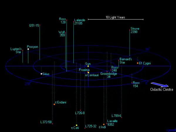 Следующие звёздные системы находятся на расстоянии в пределах 10 световых лет от Росс 128:
