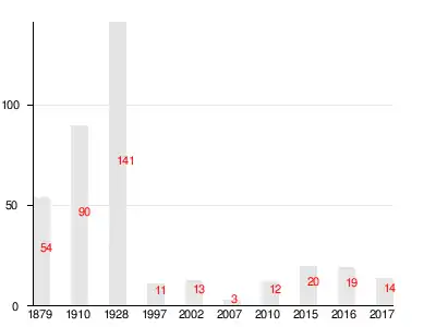 Число жителей по семейным спискам 1879 г.: 31 м. п., 23 ж. п.; по приходским сведениям 1879 г.: 31 м. п., 24 ж. п.[3]