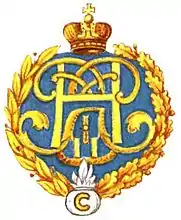 Золотой венок, увенчанный Императорской короной, на низ которого наложена серебряная граната с золотой литерой «С». Фон знака выпуклый, покрыт прозрачной голубой эмалью, на ней соединенные золотые вензеля Императоров Петра I и Николая II.