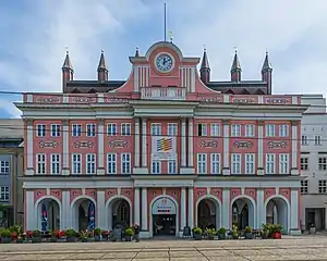 Сверху: горизонт Ростока, церковь Святой Марии, церковь Святого Петра, морской курорт Варнемюнде, ратуша, пляж Варнемюнде | ||||||||