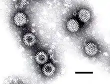 Ротавирусы (лат. Rotavirus) — род вирусов из семейства Reoviridae, сходных по морфологии и антигенной структуре. Как и другие представители этого семейства, ротавирусы обладают двунитевой фрагментированной РНК. В геноме вируса 11 фрагментов, которые окружены чётко выраженной трёхслойной белковой оболочкой (капсидом) с икосаэдрической симметрией. Внешний вид частиц напоминает «колесо с широкой ступицей, короткими спицами и чётко очерченным ободком»[4], из-за чего они и получили своё название (лат. rota — «колесо»). Диаметр вирусных частиц от 65 до 75 нм.