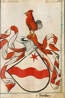 Родовой герб представляет собой белый щит белого с диагональной широкой волнистой линией красного цвета, в правом верхнем углу — красная звезда. На шлеме с красно-белым покрываром — красный петух.