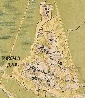 РОХМА — деревня графа Шувалова. Число душ крепостных людей мужского пола: крестьян — 64, дворовых — нет. Число дворов или отдельных усадеб — 21. Земли состоящей в пользовании крестьян (в десятинах): усадебной — 9,81, на душу — 0,15; пахотной: всего — 74,37, на душу — 1,16; сенокосы: 164,84; выгоны: 14,15; кустарник: 42,80; всего удобной — 305,97, на душу — 4,78. (1860 год)[8]
