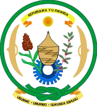 Государственный герб был принят в 31 декабря 2001 года. Он представляет собой щит с солнцем, сорго, кофейным кустом, корзиной, шестернёй и двумя щитами. По окружности герба располагается зелёное кольцо. Щиты символизируют патриотизм, защиту национальной и государственной свободы и идентичности. Зелёное кольцо является символом промышленного развития страны через упорный труд. Над ним и под ним расположились две надписи на киньяруанда — Republika y’u Rwanda (с руанда — «Республика Руанда») и Ubumwe, Umurimo, Gukunda igihugu (с руанда — «Единство, Работа, Патриотизм») соответственно[171].
