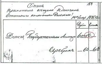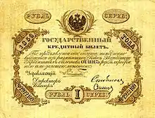 Монету достоинством в 1 рубль начали регулярно чеканить в 1704 году (первоначально в 28 граммов при содержании чистого серебра около 25—26 граммов, с 1764 года — 18 граммов[28]). В 1768 году был создан Государственный ассигнационный банк начавший выпуск «ассигнаций»[29][30] номиналом в 1, 3, 5, 10, 25 и 100 рублей. В 1843 году вместо ассигнаций Государственным коммерческим банком, который был создан в 1817 году на базе учётных контор Государственного ассигнационного банка и затем в 1860 году реорганизован в Государственный банк Российской Империи, начал выпуск Государственных кредитных билетов с аналогичной ассигнациям системой номиналов, но в отличие от последних выпуск государственных кредитных билетов был привязан к выпуску серебряных монет.