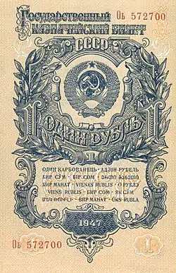 В 1950 году, главным образом для зарубежных расчётов, рубль был поставлен на золотую базу 0,222168 г, хотя его покупательная сила внутри страны была тогда ниже, чем перед войной. 15 ноября 1960 года золотое «содержание» рублей повышено до 0,987412 г и одновременно заменено 10 старых рублей на один новый. Этим рубль девальвирован на 55,5 %, но его стоимость и далее была завышена.