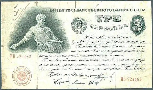 Первыми денежными знаками СССР стали банкноты номиналом в 10, 15 и 25 тысяч рублей, выпущенные согласно постановлениям ЦИК и СНК СССР от 23 ноября[4] и 18 декабря 1923[5] и от 7 февраля 1924 года[6] соответственно. Первым постановлением также предполагался выпуск денежных знаков номиналом 100, 250, 500, 1000 и 5000 рублей, однако он так и не был осуществлён.