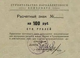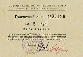 Для внутренних нужд предприятия были выпущены в обращение расчётные знаки. Точное назначение их не известно. На аверсе бон указано, что расчёты производились между цехами и Рудоуправлением. Номиналы 1, 3, 5, 50, 100 рублей.