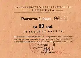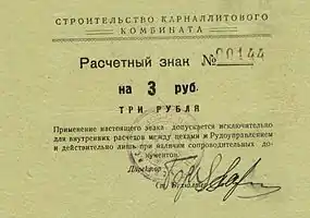 Суррогатные деньги были введены в оборот в сложное время индустриального развития Соликамска. Для десятков тысяч прибывших на стройку заключённых и спецпереселенцев занятость на строительстве и, впоследствии, запущенном в эксплуатацию карналлитовом комбинате — была единственным источником существования.