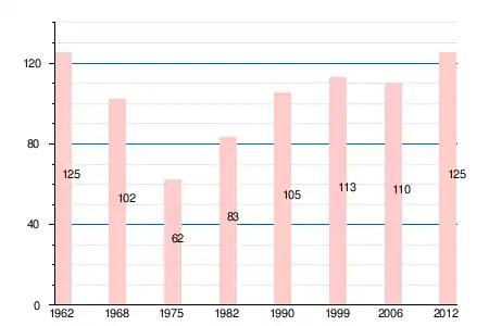 | 1962 | 1968 | 1975 | 1982 | 1990 | 1999 | 2005 | 2006 | 2010 | 2011 | 2012 |