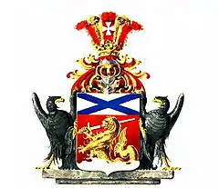 Щит увенчан дворянским коронованным шлемом. Нашлемник: пять страусовых перьев: на среднем червленом серебряный крест с широкими концами, крайние — червлёные, второе и четвёртое — золотые, Намёт: червлёный с золотом. Щитодержатели: два чёрных орла с червлёными глазами, золотыми клювами и лапами[2].