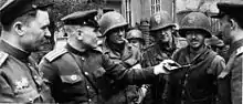 К середине дня 24 апреля наступила полная тишина. Такое на войне всегда настораживает, и я доложил о своем беспокойстве командиру дивизии. Он мне приказал отправить утром 25 апреля за Эльбу разведку, но с условием: огонь открывать только в случае крайней необходимости и удаляться от реки не далее 10 километров. В разведку я послал 6 стрелковую роту под командованием старшего лейтенанта Григория Голобородько. Утром 25 апреля 1945 года она переправилась через Эльбу и без всякого сопротивления продвинулась до высоты 129,7 у поселка Леквиц, в километре севернее Штрелы. В 11.30 Голобородько доложил мне по рации, что они встретились с американскими военнослужащими. Задачу свою рота выполнила, и я приказал ей возвратиться в расположение полка, пригласив в гости наших американских союзников. Спустя некоторое время рота Голобородько вернулась в Крайниц. Вслед за ней сюда же прибыл и американский патруль. Это было в 13.30. О встрече я доложил командиру дивизии. Он приказал мне принять американских гостей. От командира дивизии прибыли начальник штаба подполковник Спиридон Рудник, майор Анатолий Иванов и другие представители. Я и мои заместители Яков Козлов, Тосолтан Битаров, Владимир Лысов подошли к паромной переправе, где уже находились американцы. Это был патруль 69 й пехотой дивизии армии США из состава 273-го пехотного полка под командованием лейтенанта Альберта Котцебу. Вскоре к нам подошли многие наши солдаты и офицеры.