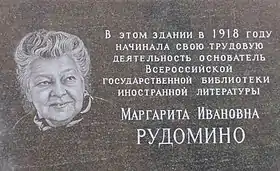 - Всероссийская государственная библиотека иностранной литературы имени М. И. Рудомино (Москва), на первом этаже которой в 2021 году установлен памятник её основательнице[3]