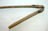 Прялка детская (на первом плане). Состоит из донца (подставки) и стоячка (лопастки).