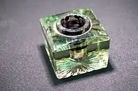 Чернильница[25]. Конец XIX — начало XX вв. Описание: форма куба, сверху цилиндрическое отверстие для чернил, бока гладкие, низ — лучи от центра. Размеры: 4х4х4 см. Материал, техника: стекло, фабричное производство, штамповка.
