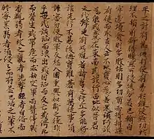 Те же параметры при более интенсивной золотисто-жёлтой или золотисто-коричневой окраске сохраняла и бумага VII века, толщиной 0,05—0,06 мм[20]. Жёлтая «банкнотная» бумага была дорога́; в Дуньхуане — библиотеке буддийского монастыря — на ней переписывали рукописи сутр, винаи, шастр. В столичных библиотеках на такой бумаге переписывали и даосских классиков. Для комментариев использовали другую бумагу, поэтому рукописи, переписанные на ней, часто потёрты, чего с жёлтой бумагой практически не случалось[21]. Более грубую бумагу использовали для деловых документов, не предназначенных для хранения и многократного использования. В смутный период второй половины VIII — первой половины X веков производство бумаги, видимо, резко сократилось. Дуньхуанские рукописи этого периода переписаны на разных нестандартных сортах бумаги, преимущественно грубых. Возможно, это объясняется тибетским завоеванием 774—848 годов, отрезавшим монастырь от китайских центров производства. После прихода к власти династии Сун качество бумаги вновь резко повышается, и появляются признаки стандартизации. Сунская бумага имела толщину 0,2—0,3 мм, для неё характеры хруст и гладкая поверхность, цвет её светло-коричневый или светло-серый. Поскольку тот же сорт бумаги использовался в ксилографах XI века из Хара-Хото (также на периферии Китая), можно предположить, что в эпоху Сун существовали государственные стандарты производства бумаги, объясняющие её устойчивое единообразие на протяжении как минимум 200 лет[22].