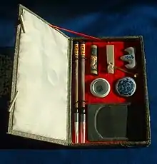 Для нанесения текста использовались кисти и чернила, образцы которых обнаруживаются в захоронениях начиная с эпохи Чжаньго. Кисть представляла собой пучок заячьей и волчьей шерсти, пропущенной в бамбуковую ручку длиной 20—30 см, диаметром от 0,4 до 1,5 см. Пучок перехватывали тонким шнуром при выходе из ручки. На неё для прочности могли надевать костяные ободки и сверху, и снизу (образец из Шуйхуди). Кисти могли хранить в бамбуковых пеналах, образцы которых сохранились. Для письма использовали чернила, изготовляемые из пережжённого графита, смешанного с желатином. Бруски чернил находят во многих погребениях. Более многочисленны находки чернильниц разнообразной формы[11].