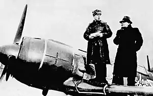 На крыле одного из двух самолетов Ла-5Ф «Веселые ребята», переданных джаз-оркестром Леонида Утесова летчикам 5-го ГвИАП, стоят комиссар полка В. Рулин (слева) и Л. Утесов (справа)