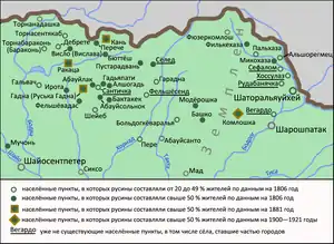 К первой половине XIX века, по данным Г. Бенедека, на территории современной Северо-Восточной Венгрии насчитывалось 54 русинских села. Общая численность русинов составляла около 35—40 тысяч человек[79]. К этому времени русины говорили преимущественно на родном языке[~ 10]. Русинско-венгерское двуязычие, давшее начало процессу мадьяризации, стало распространяться в русинских сёлах только с конца XIX века[81]. После Второй мировой войны русиноязычное население Венгрии значительно сократилось, что было вызвано среди прочего обменом населения в 1946—1948 годах в рамках договора, по которому венгры переселялись из Чехословакии в Венгрию, а русины вместе со словаками переселялись из Венгрии в Чехословакию (в частности, из Комлошки выехали 64 семьи, бо́льшая часть из них на территорию чешско-германского пограничья). Также численность русинов сокращалась в результате продолжавшейся мадьяризации, которую ускоряли межнациональные браки и переселение русинов в поисках работы из сёл в города разных регионов Венгрии. Так например, к 1941 году в Комлошке жили 964 человека, а к началу XXI века в селе осталось около 400 человек (порядка 130 семей), при этом число школьников сократилось со 182 до 24[79]. По словам Э. Балецкого, уже в 1950-х годах во всех русинских сёлах, кроме Комлошки и Мучони, оставалось лишь небольшое число лиц старшего поколения, говоривших по-русински или знавших только отдельные слова или молитвы на родном языке[77]. В частности, венгерский лингвист П. Кирай сообщает о 10 сёлах, в которых говоры, сочетавшие в себе восточнославянские (русинские) и западнославянские (восточнословацкие) черты, постепенно выходили из употребления, уступая место венгерскому языку. Жители этих сёл (Вегардо, Кань, Алшогадь, Гадьапати, Саразкек (Бактакек), Абауйсольнок, Гадна, Ракаца, Ирота и Абод) имели размытое этническое самосознание, но чаще всего они называли себя русинами, а свой язык русинским (ruski), что поддерживалось принадлежностью их к грекокатолической вере (rusnaki)[82]. М. Капраль к числу сёл Северо-Восточной Венгрии, в которых до недавнего времени сохранялись русинские говоры, относит также Гёрёмбёль, Шайопетри, Шайопалфалу, Модёровшку, Башко и другие[43]. В селе Комлошка, в котором русинский к 1950-м годам сохранялся у большинства его жителей, постепенно распространялся русинско-венгерский билингвизм. К середине XX века по-венгерски могли говорить почти все комлошчане[81]. Следующим этапом ассимиляции стал переход русинов Комлошки, главным образом, молодого поколения к венгерскому одноязычию, который завершился к концу XX — началу XXI века. Так, например, ещё в 1980-х годах дети в комлошковском детском саду, по сведениям Г. Бенедека, говорили между собой только по-русински, а в 2010-х годах все дети в Комлошке говорят уже только по-венгерски[83]. В Мучони на рубеже XX—XXI веков среднее и молодое поколения русинов полностью перешли к венгерскому одноязычию, русинский сохранился в устном бытовом общении только у незначительной части жителей села старшего поколения. По данным М. Капраля, на ассимиляцию мучоньских русинов повлияло среди прочего переселение большого числа венгерских рабочих, которых привлекли для работы на действующем вблизи села добывающем предприятии[43].