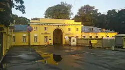 - Главный вход на Смоленское православное кладбище — два корпуса богадельни, соединённые аркой ворот