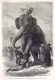 Казнь слонами, изображённая в «Le Tour du Monde», 1868.