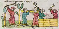 Строительство городских ограждений. Миниатюра из Радзивиловской летописи