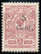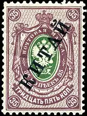 | 6 | 1917 | Типографская диагональная надпечатка номинала в китайской валюте чёрного цвета на марках России 13-го, 16-го, 17-го и 19-го выпусков[≡] |