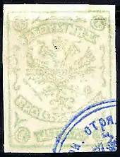 Одноцветная печать ручным штемпелем на гладкой рифлёной или клетчатой бумаге. Синий контрольный знак. Без зубцов. |