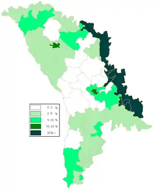 Согласно итогам переписи населения 1989 года в Молдавской ССР проживало около 600 тысяч русских[2]. В 2004 году были проведены переписи населения Молдавии и Приднестровья, которые выявили резкое сокращение числа русских и русскоязычных на прежде единой территории Молдавии[2]. В Молдавии (без учёта Приднестровья) была зафиксирована 201 тысяча русских, в Приднестровье — 165 тысяч[2]; таким образом, за 15 лет русское население в целом уменьшилось примерно на 40 % (с почти 600 тысяч до 366 тысяч)[2].