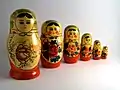 - Матрёшка — русская деревянная игрушка в виде расписной полой куклы, внутри которой находятся подобные ей куклы меньшего размера. По традиции рисуется женщина в красном сарафане и желтом платке. В последнее время темы росписи сувенирных матрешек не ограничены, встречаются как куклы, расписанные под сказочных персонажей, так и в виде карикатур на известных политиков. Хотя матрешку принято считать оригинальной русской игрушкой, появилась она сравнительно недавно, в 1891 году в Абрамцеве[1], как оригинальная версия менее известной японской деревянной игрушки. Сегодня матрёшка является одним из самых популярных сувениров, привозимых из России.