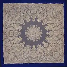 - Вологодское кружево — русское кружево, плетёное на коклюшках (деревянных палочках); распространено в Вологодской области с XVI–XVII века. Все основные изображения в сцепном вологодском кружеве выполняются плотной непрерывной, одинаковой по ширине, плавно извивающейся тесьмой, они чётко вырисовываются на фоне узорных решёток, украшенных насновками в виде звёздочек и розеток.