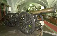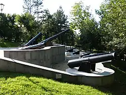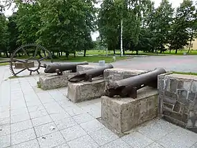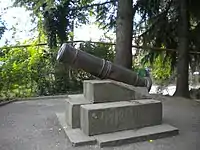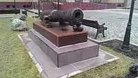 | 142 | Сестрорецкий инструментальный завод, город Сестрорецк, Санкт-Петербург | ![]() | Каменский чугунолитейный завод | 1865 | 60-ти фунтовая пушка системы Маиевского образца 1857 года | На левой цапфе пушки клеймо — «Каменской заводъ» №89, на правой цапфе год изготовления – 1865 и вес 387 пудов[30]. Пушки и якорь памятника «Пушки», установленного в 1991 году, были демонтированы на фортах Кронштадта. Пушечные лафеты изготовил цех завода, а одна из пушек является шведской. |