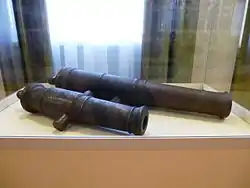 | 31 | Новокузнецкий краеведческий музей, г. Новокузнецк, Кемеровская область | ![]() | Каменский чугунолитейный завод | 1802 | 12-фунтовая пушка | В 1867 году в Кузнецкой крепости оставалось только 6 пушек. В конце 1919 г. одно из этих орудий захватил партизанский отряд, который тогда находился в окрестностях Кузнецка, и использовал при штурме с. Тогул. Эта пушка установлена в селе на центральной площади. Остальные 5 пушек до 1927 г. находились на крепостных полубастионах, затем они были сброшены вниз. В составленном 27 декабря 1934 г. "Описании крепости…" говорилось, что пушек на крепости уже нет. В настоящее время 4 из пяти оставшихся орудий Кузнецкой крепости установлены у входа в Новокузнецкий городской краеведческий музей[5]. №№33-36 списка Шевалева В.П. |