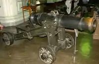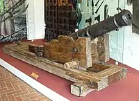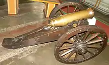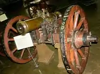 | 128 | Оренбургский губернаторский историко-краеведческий музей, г. Оренбург, Оренбургская область | ![]() | вторая половина XVIII в | 3/4-фунтовая пушка | 3/4-фунтовая пушка (34-мм). Ствол бронзовый. Длина 82 см. Масса 51 кг. Отлит во второй половине XVIII в. Ствол укреплён на деревянном двухколёсном самодельном лафете коробчатого типа (колёса более позднего изготовления). Пушка находилась на вооружении восставших в годы Кресьянской войны (1773—1775) В 1872 это орудие под названием "пугачёвской пушки" было представлено на Московской политехнической выставке | |