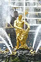 Другим выдающимся скульптором русского классицизма XVIII века стал Михаил Иванович Козловский, также ученик Жилле. Он продолжал художественное образование в Париже и Риме. В Италии, по его собственным словам, находился одновременно под впечатлением «ужасного дарования» Микеланджело и идиллического — Пуссена. В скульптуре Козловскому удалось совместить трудно сочетаемые идеалы классицизма и живописность формы, свойственную стилю барокко[20]. Именно такими качествами обладает огромная фигура «Самсона, раздирающего пасть льва» (символ побеждённой в Северной войне Швеции) — фонтана «Самсон», созданная Козловским для Большого каскада в Петергофе. Скульптура является повторением аналогичной петровского времени. Утраченная во время Великой Отечественной войны, воссоздана в 1947 году по довоенным фотографиям скульптором В. Л. Симоновым.