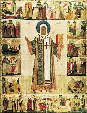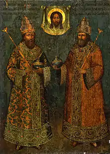 Например, в иконе «Положение риз» (ок. 1630)[13], где изображено получение царем Михаилом и патриархом Филаретом реликвии, реальные личности изображены в конкретной обстановке внутри собора, переданного с документальной точностью. По существу, это историческая картина-портрет. Интересен и групповой портрет купцов Никитниковых (Церковь Троицы в Никитниках, роспись 1652—1653) в сцене «Великого входа»)[14].