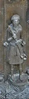 На «Корсунских воротах» Новгородской Софии расположен автопортрет литейщика Аврама (XIV века). Он изобразил себя в коротком русском кафтане с клещами и молотком в руках. Это уже шаг от сугубо идеализированных образов князей[4].