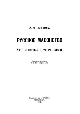 - Пыпин А. Н. Русское масонство. XVIII и I четверть XIX в. / Ред. и прим. Г. В. Вернадского. — Петроград: изд. «Огни», 1916. — 580 с. — Альфарет, 2008.
