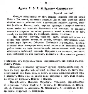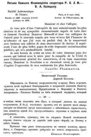 В феврале 1912 года Совет РОЛМ направил известному французскому учёному Камиллу Фламмариону адрес в связи с исполнившимся 50-летним юбилеем его служения великой науке о Вселенной. Фламмарион, как никто из современных мироведам учёных, был близок им по духу, поскольку утверждал, в частности: