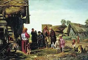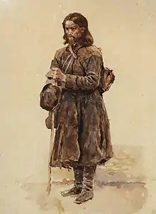 Доктор исторических наук, главный научный сотрудник Музея антропологии и этнографии имени Петра Великого Татьяна Бернштам относила русское странничество к практике народного домостроительства, главными признаками которого считала а) «обетное происхождение» и б) «ведущую роль индивидуального начала». Состав странников был, с её точки зрения разнообразен, но имел постоянное ядро, которое состояло из людей разного нравственного состояния и различной «вероисповедальной „чистоты“», которые непрерывно осуществляли своё подвижничество и были носителями особой идеологии странничества[36]. Представители этой группы носили полумонашескую одежду: верхняя одежда монашеского покроя или прикрывающая некую монашескую деталь — рясу, власяницу… Мужчины носили скуфью или ходили без головного убора, часто ходили босиком. Атрибутами статуса странника был посох с оригинальной отметиной (резьба, крест, благословляющая рука в качестве навершия) и холщовая сума (в конце XIX века её заменяли гимназический ранец, кожаный чемодан или ковровая сумка для бани)[37]. В сутки странник проходил около 20 вёрст. Первоначально странники останавливались в доме священника или членов причта. В позднее время приходское духовенство часто относилось к ним враждебно, считая еретиками или смутьянами[38]. Странники-плуты часто ходили группами, распределив заранее между собой роли. Приходское духовенство настороженно относилось к группам оседлых странников (такие женщины-странницы носили названия «келейницы», «чернички» или «вековушки»), которых могло насчитываться до 100 человек в одном месте[39].