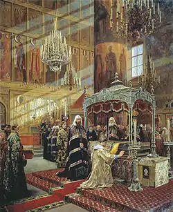 К середине XVI века правитель Русского государства стал сильным самодержцем — царём. Принятием этого титула московский государь подчеркнул, что является главным и единственным правителем России, равным византийским императорам или монгольским ханам. После венчания в 1472 Ивана III и Софьи Палеолог, наследницы последнего византийского императора, Великое княжество Московское наследовало византийские традиции, ритуалы, титулы и герб Византийской империи — двуглавый орёл, ставший гербом России.