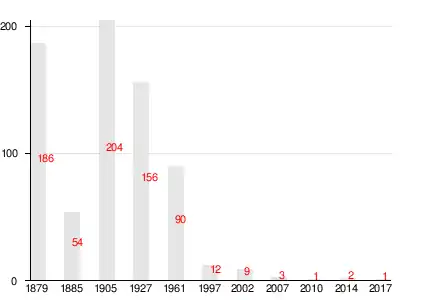 | 1879 | 1885 | 1905 | 1927 | 1961 | 1997 | 2007[15] |