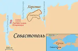 Древний Херсонес Таврический (древнерус. Корсунь, совр. территория Севастополя) располагался на скалистом участке побережья Крыма, примыкая на востоке к бухте Карантинная и вытягиваясь вдоль берега моря в сторону бухты Песочная на западе.[7] Основали его в конце V в. до н. э. греческие колонисты, выходцы из Гераклеи Понтийской.