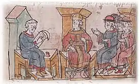 ![]() Приём византийским императором Иоанном Цимисхием послов князя Святослава Игоревича и запись писцом на пергамене условий мирного договора, предложенных Святославом. Миниатюра из Радзивилловской летописи, конец XV века | |