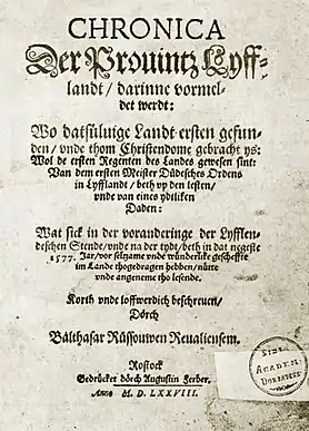 - Руссов, Бальтазар. Ливонская хроника. Восточная литература. Дата обращения: 28 февраля 2011.